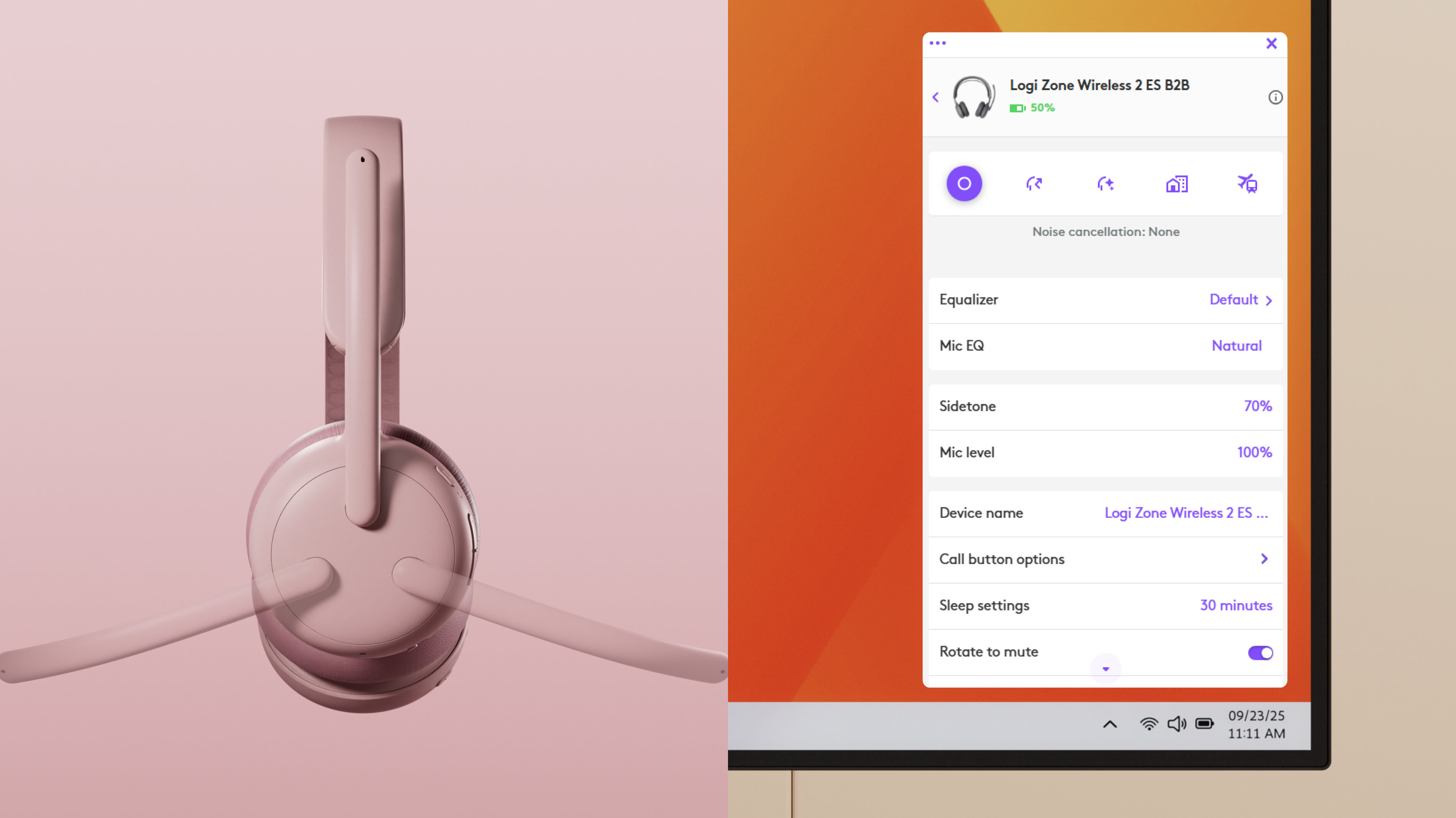 Thoughtfully engineered hardware and software provide options to personalize your Zone Wireless 2 ES headset. Adjust the headband, rotating earcups, and 270° mic boom. Customize ANC levels, Mic EQ, and more with Logi Tune on desktop and mobile devices.