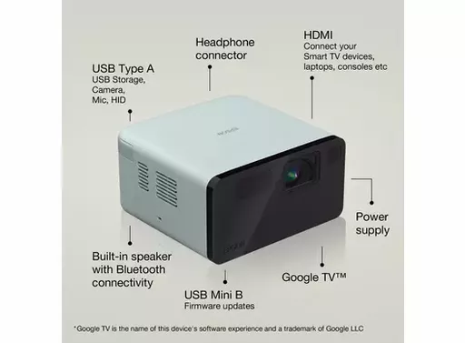 Everything you stream. All on one screen. Access 400,000+* movies and TV episodes, all in one place. Google TV™ brings your favourite content from across your apps and subscriptions and organizes them just for you. Ask Google Assistant to find movies, stream apps, play music and control your projector - all with your voice*. Easily cast movies, shows, photos, and more from your phone or tablet, right to your projector with Google Cast*. The built-in 5W Bluetooth speakers can be used with or without a visual display.